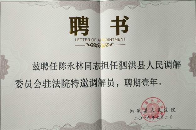 2019年7月,江蘇省泗洪縣人民法院按照江蘇省高級(jí)人民法院有關(guān)規(guī)定聘請(qǐng)執(zhí)業(yè)律師擔(dān)任特邀調(diào)解員。江蘇可行律師事務(wù)所陳永林律師應(yīng)邀出任特邀調(diào)解員一職。