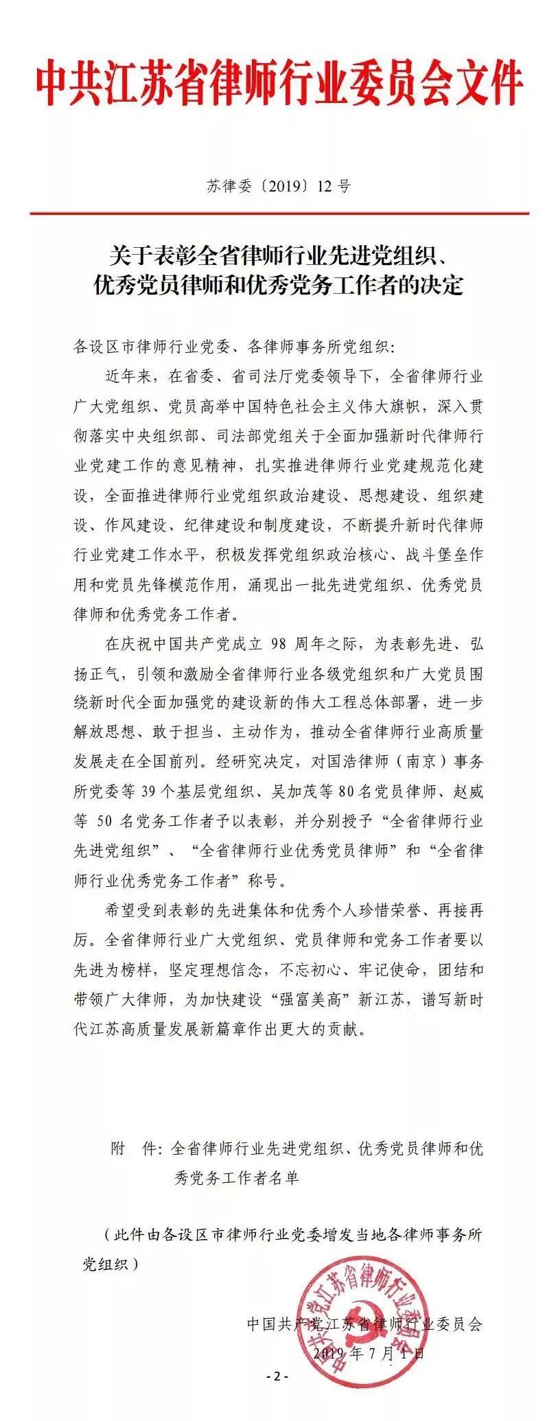 2019年7月1日,中國共產(chǎn)黨成立98周年之際,為表彰先進、弘揚正氣,引領(lǐng)和激勵全省律師行業(yè)各級黨組織和廣大黨員圍繞新時代全面加強黨的建設(shè)新的偉大工程總體部署,進一步推動全省律師行業(yè)高質(zhì)量發(fā)展。江蘇省律師行業(yè)黨委對39個基層黨組織、80名黨員律師、50名黨務(wù)工作者予以表彰。