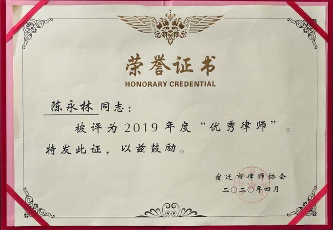熱烈祝賀陳永林律師被宿遷市律師協(xié)會(huì)授予2019年度宿遷市優(yōu)秀律師榮譽(yù)稱號(hào)